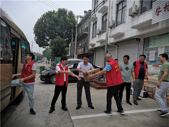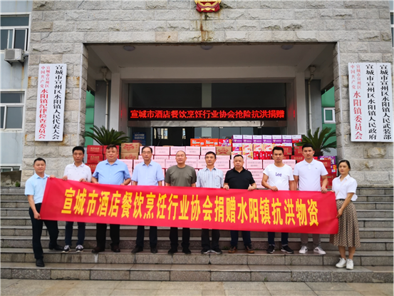 区政协委员、宣城市大富豪酒店服务有限公司总经理谷强胜携宣城市酒店餐饮烹饪行业协会向水阳镇捐赠杭洪抢险物资。