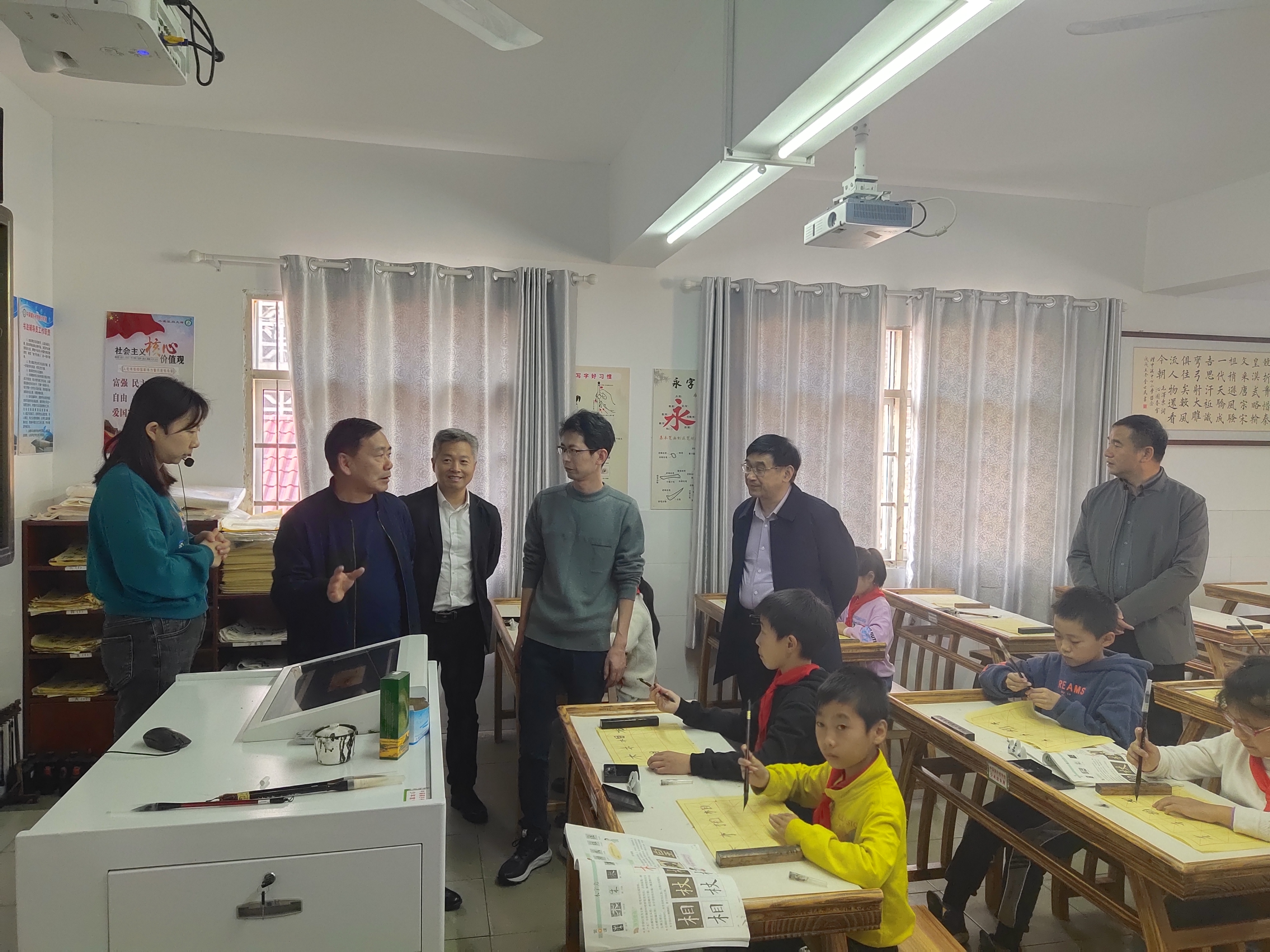 10月29日,宣城市政协副主席、市书法教育工作督导组组长宦朝东来宁国调研中小学书法教育工作,宁国市政协副主席晏国成陪同。