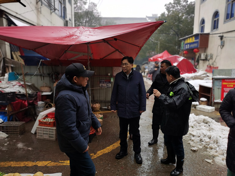 在狸桥镇,时国金首先听取了狸桥低温雨雪冰冻灾害天气应急工作情况的汇报,详细了解除雪除冰、道路交通保障、物资储备、电力运行等情况。随后时国金来到云山路和农贸市场,实地查看道路除雪除冰和群众生活物资保障情况。