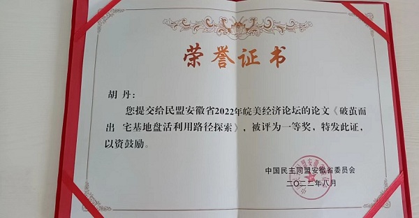 8月27日至28日,由民盟省委主办、民盟省委经济委员会和民盟蚌埠市委承办的民盟安徽省2022年皖美经济论坛在蚌埠市举办。我市盟员胡丹撰写的《破茧而出 宅基地盘活利用路径探索》荣获优秀论文一等奖,并作为5位获奖作者代表之一在大会现场进行交流发言。